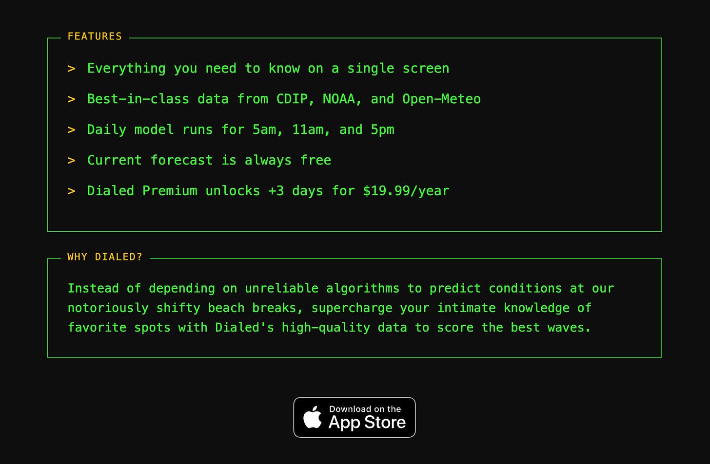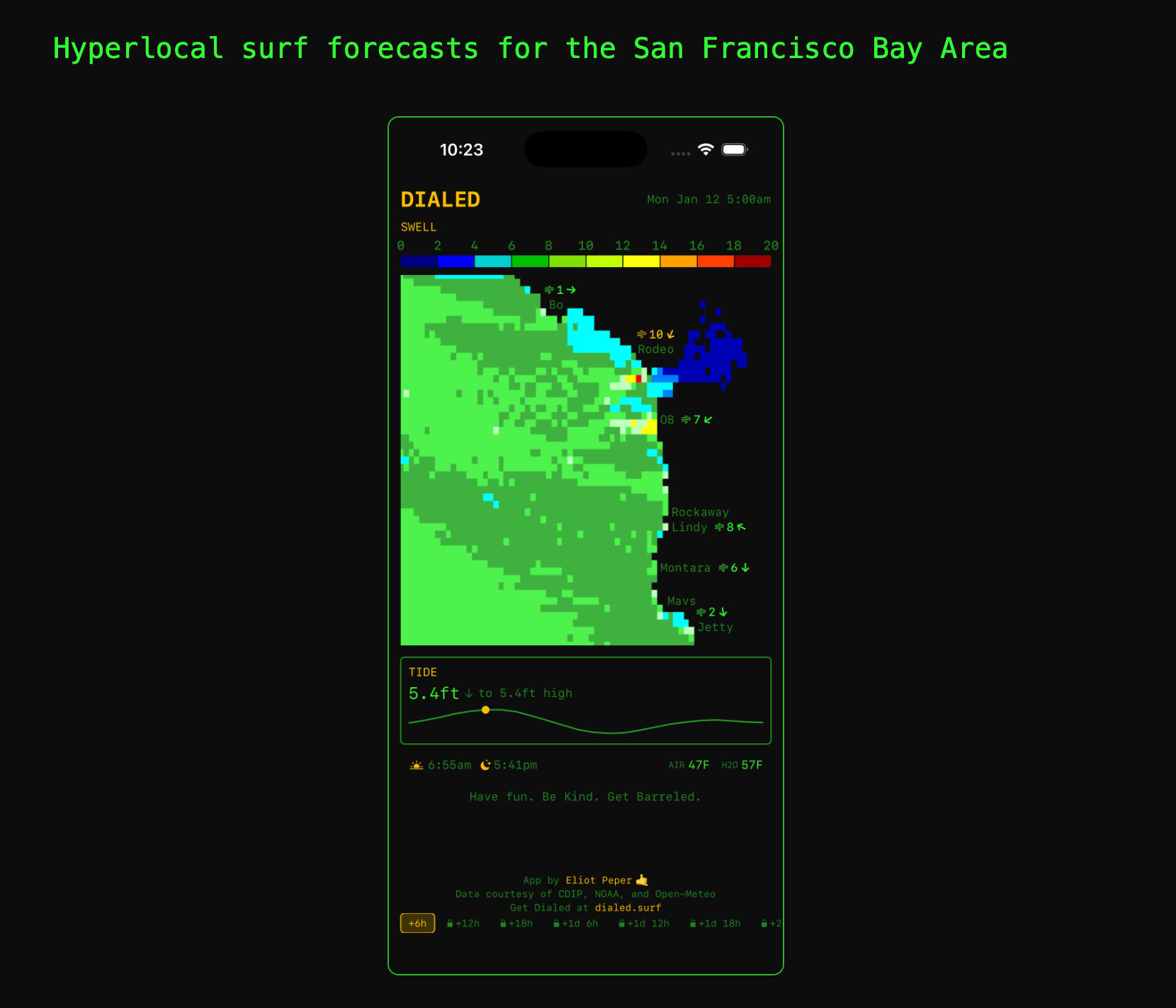 Dialed is extremely simple. All it does is bring data from different public sources into one place to help you decide when and where to surf along this beautiful stretch of coastline.